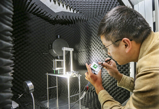 A technician at a high-tech manufacturing company inspects in-house developed electronic component protection products. Photo: IC PHOTO