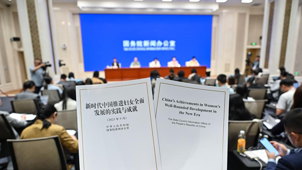 This photo shows copies of the white paper titled "China's Achievements in Women's Well-Rounded Development in the New Era" released by the State Council Information Office (SCIO) during a press conference in Beijing, capital of China, on September 19, 2025. /Xinhua